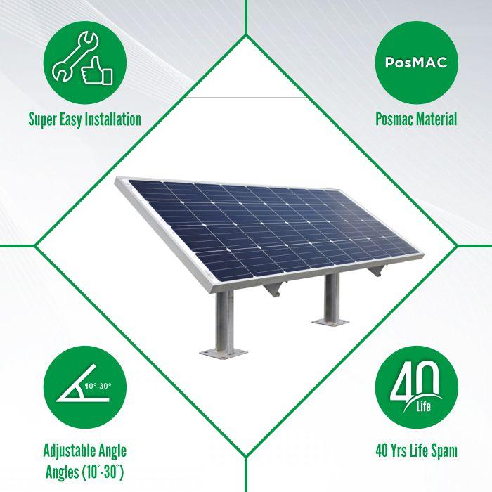 Loom solar introduces portable solar mounting structure / solar panel stand to fix 1 nos. of solar panel. A solar panel from 125 watt ~ 180 watt of any brand and any make can be installed on a home roof. The portable solar panel stand is made of galvanized iron, the rust proof solar panel stand life is is more than 25 years.