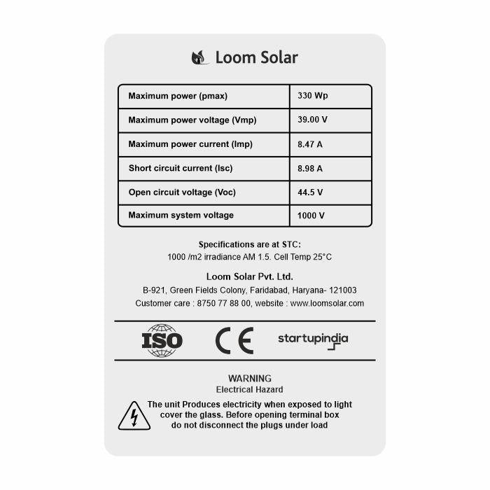 Loom Solar launches 330 Watt solar panels made of A grade Black silicon cells in 24 Volt design to generate electricity from sun. The cells are made of superior quality silicons which gives cell conversion efficiency up to 16%. It is the best solar panels in multi crystalline technology that comes with 5 busbars and 36 cells, 10 years manufacturing defects warranty and 25 years performance warranty. IP 67 rated junction box is given with MC4 compatible cable connector for higher module efficiency.